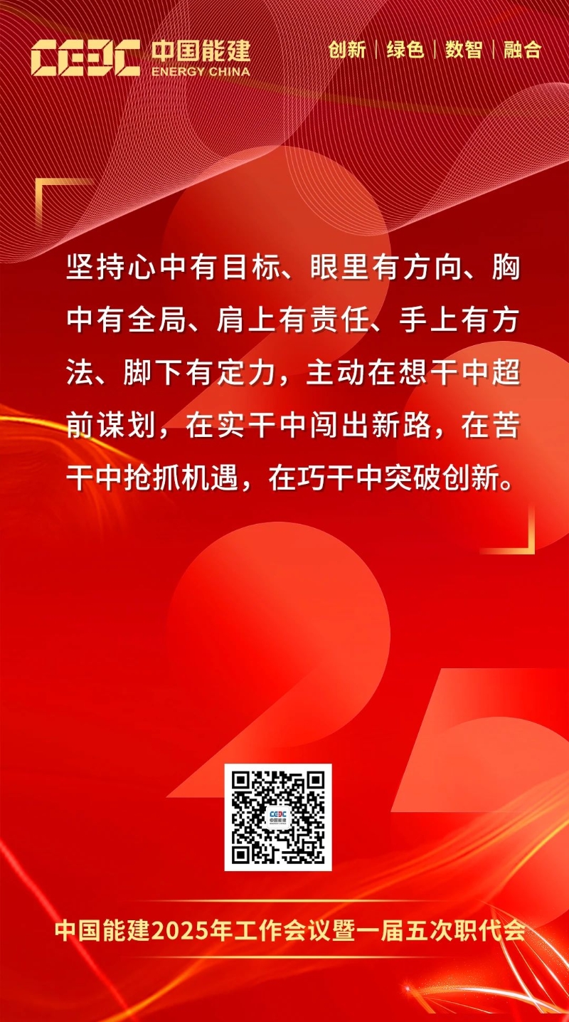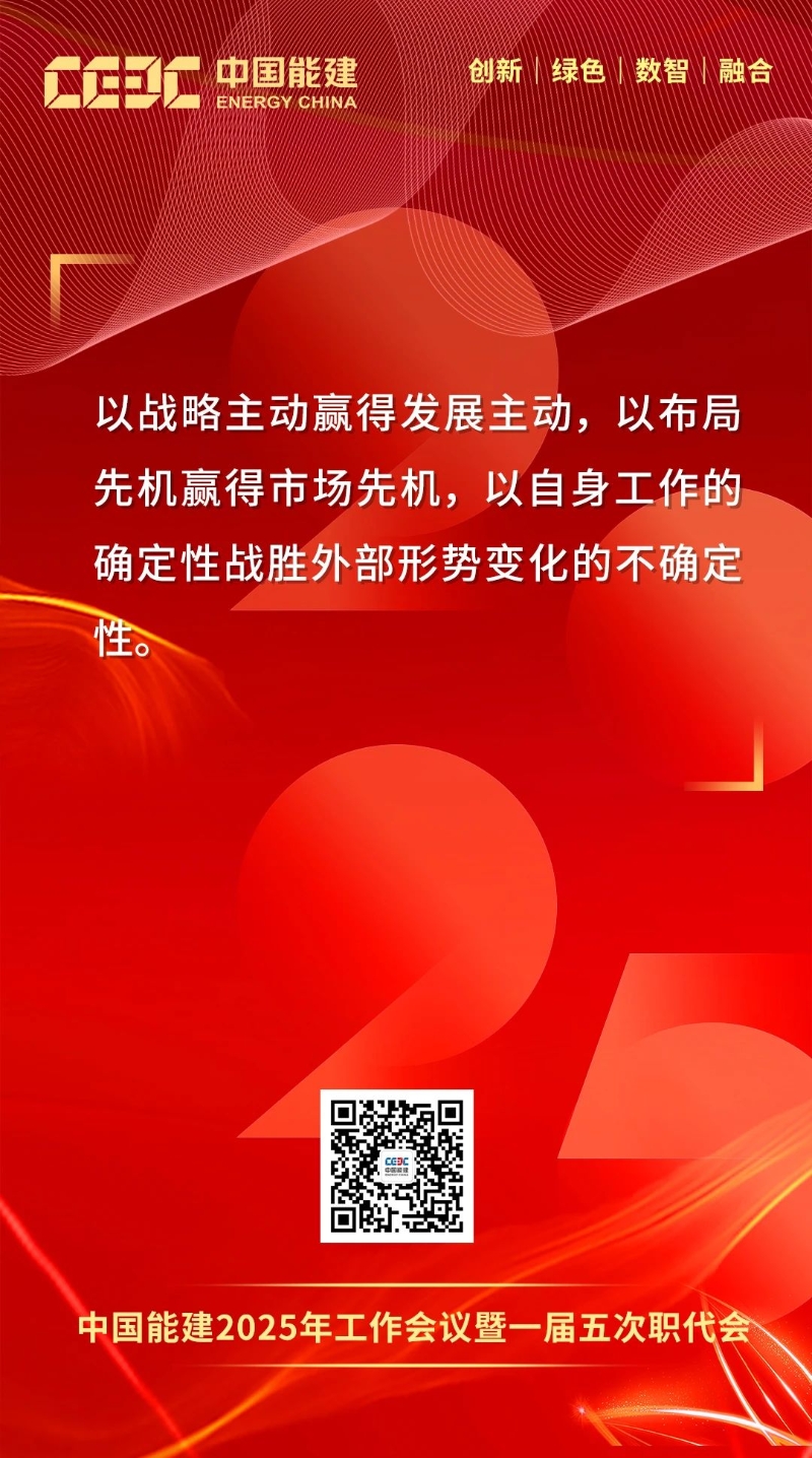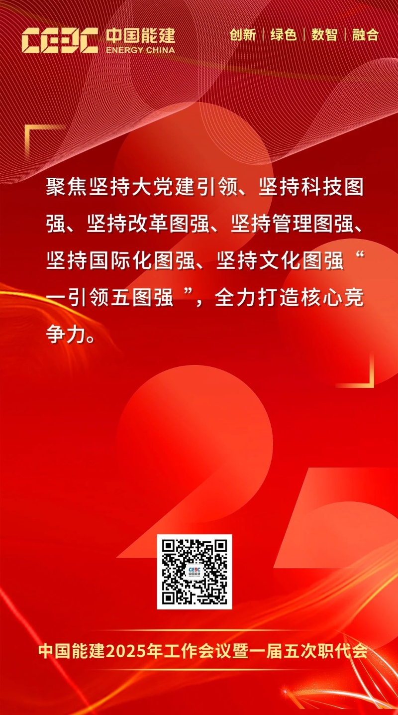 1月16日-17日,中國(guó)能建2025年工作會(huì)議暨一屆五次職代會(huì)在京召開。會(huì)上,中國(guó)能建黨委書記、董事長(zhǎng)宋海良發(fā)表題為《保持戰(zhàn)略定力 突出科技引領(lǐng) 強(qiáng)化價(jià)值創(chuàng)造 狠抓落地轉(zhuǎn)化 奮力譜寫高質(zhì)量發(fā)展“四新”能建嶄新篇章》的講話。