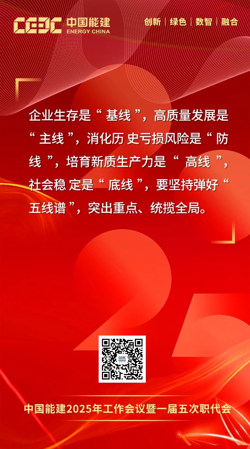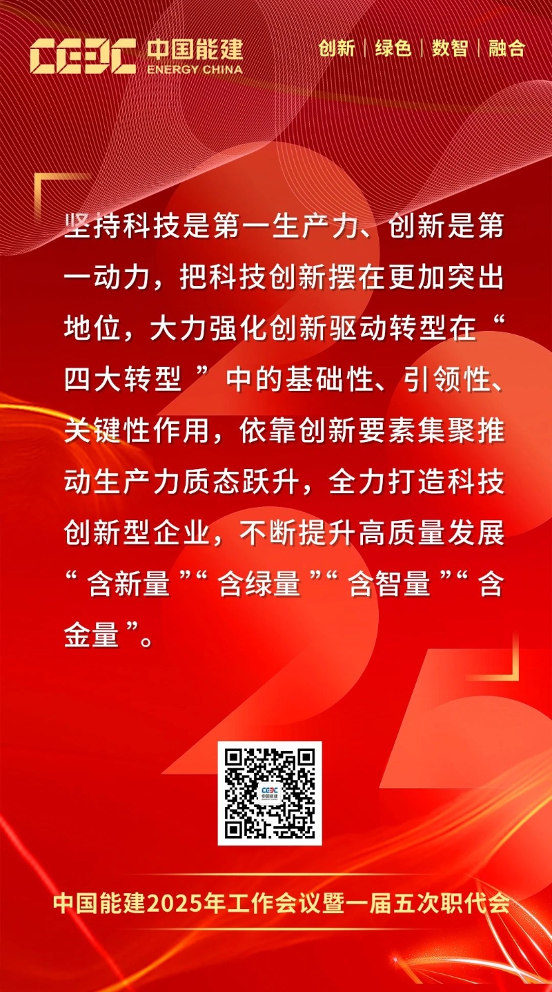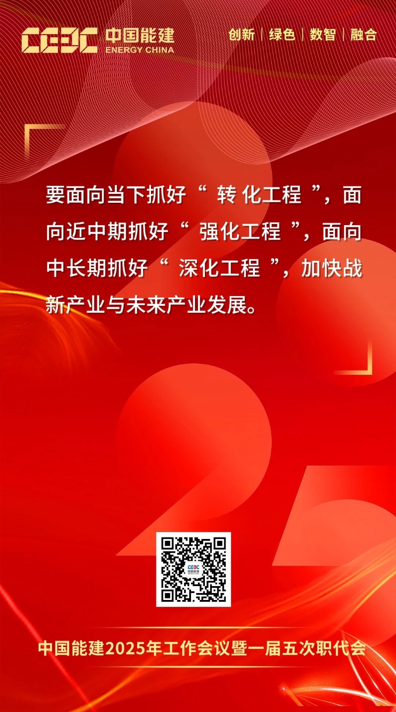 1月16日-17日,中國(guó)能建2025年工作會(huì)議暨一屆五次職代會(huì)在京召開。會(huì)上,中國(guó)能建黨委書記、董事長(zhǎng)宋海良發(fā)表題為《保持戰(zhàn)略定力 突出科技引領(lǐng) 強(qiáng)化價(jià)值創(chuàng)造 狠抓落地轉(zhuǎn)化 奮力譜寫高質(zhì)量發(fā)展“四新”能建嶄新篇章》的講話。